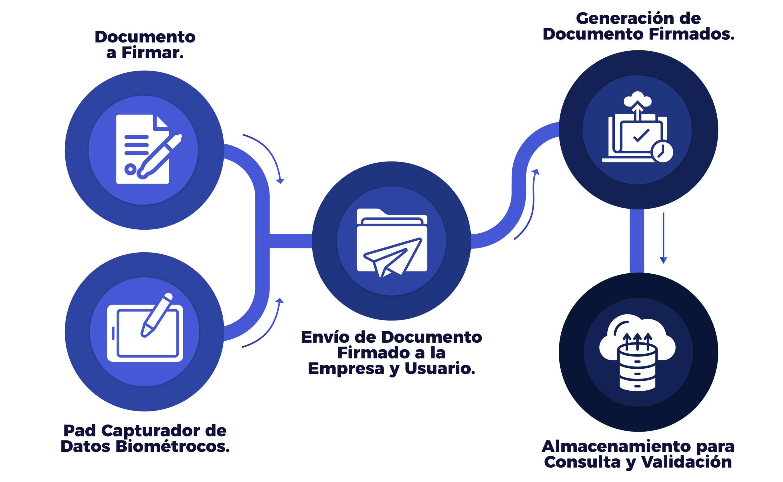 Permite obtener del titular o cliente la firma de documentos electrónicos (Inmaterializados), a través de: