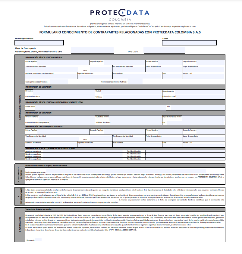 Si desea ser proveedor o cliente de la compañía, lo invitamos a diligenciar nuestro formulario de conocimiento de contrapartes relacionadas con Protecdata Colombia SAS y dar el primer paso para crear alianzas significativas.