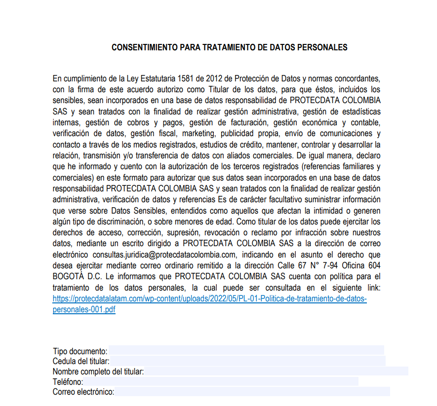 Diligencie nuestro consentimiento para el tratamiento de datos personales, conforme a lo establecido en la Ley 1581 de 2012 y autorice el tratamiento de sus Datos.